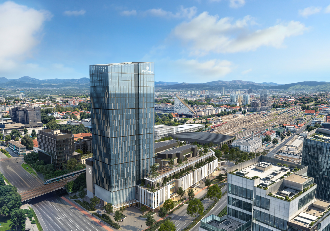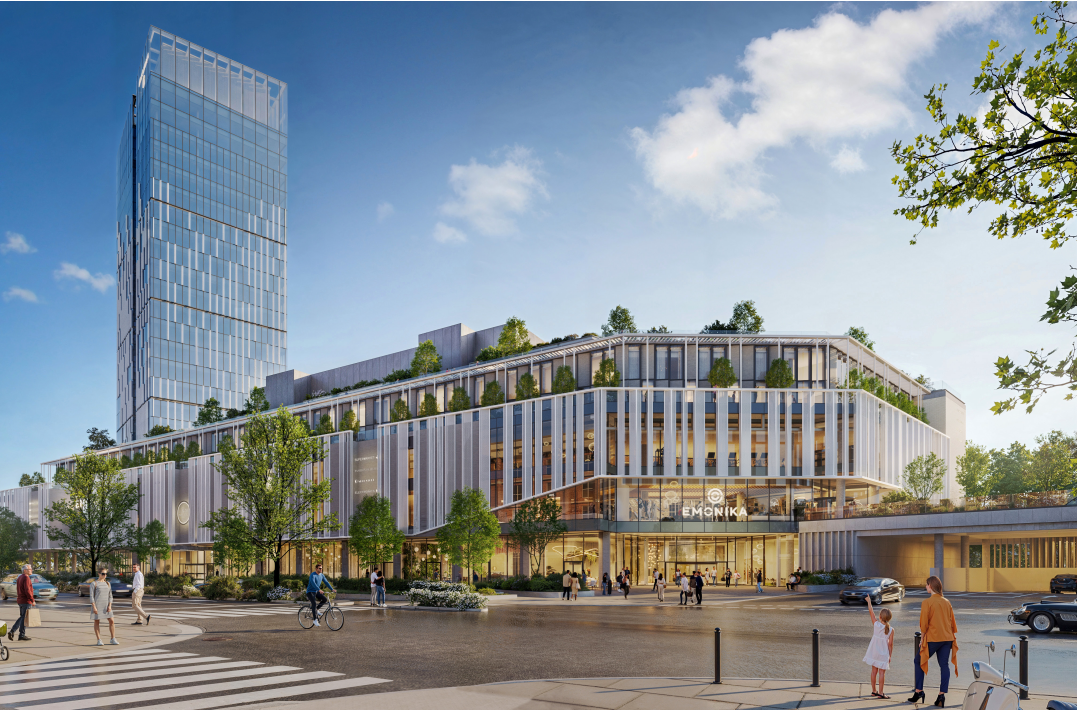 The new Emonika business and commercial building, with its 200,000 m2 of surface area and exciting architecture, is designed as a center that offers living (apartment and hotel), work, entertainment, leisure, and shopping. The basic dimensions of the building are dictated by the construction plan, which foresees several elegant vertical elements, such as a 100 m high office tower, which will also be the new tallest building in Ljubljana, and a 40 m high block with a lower structure in the background.