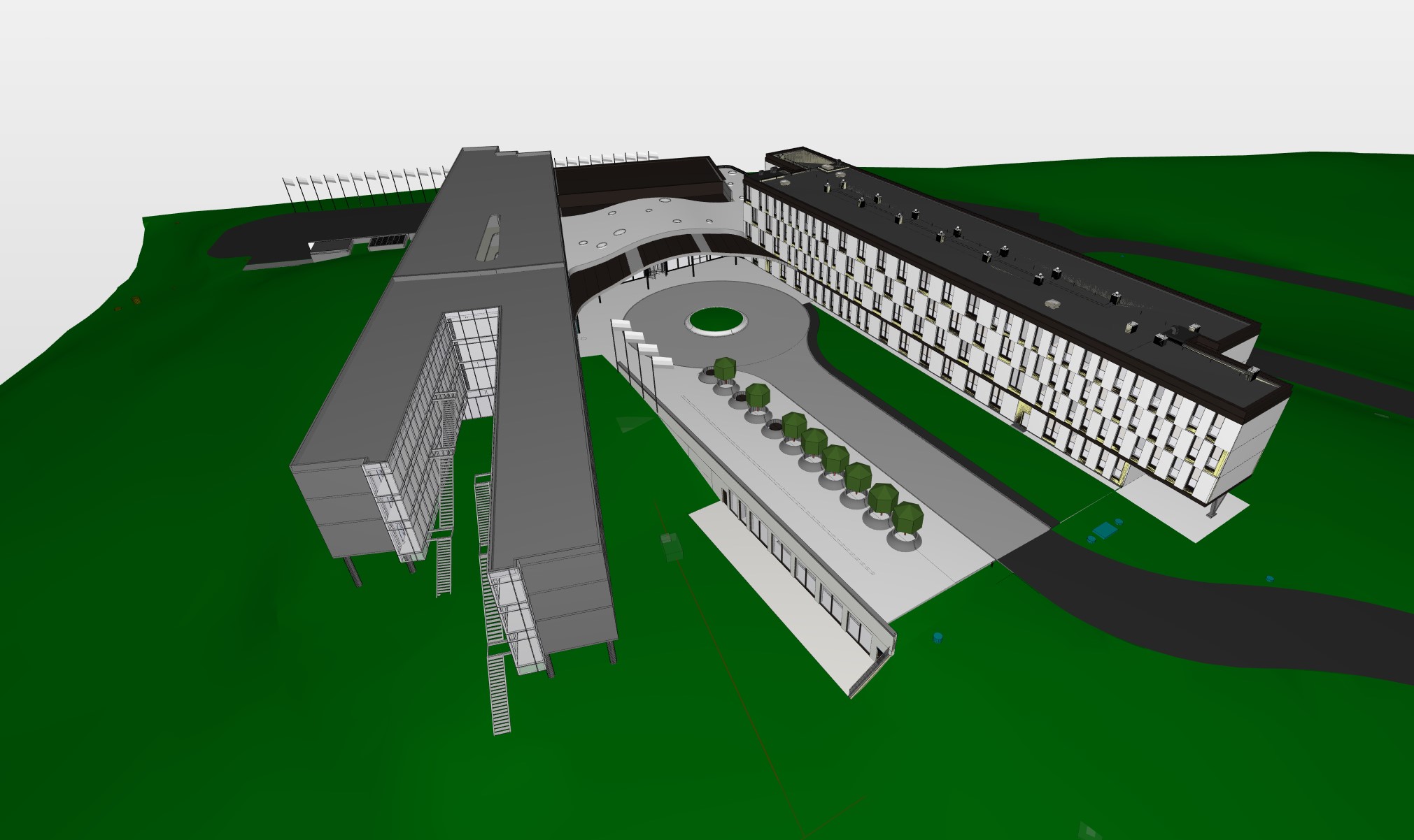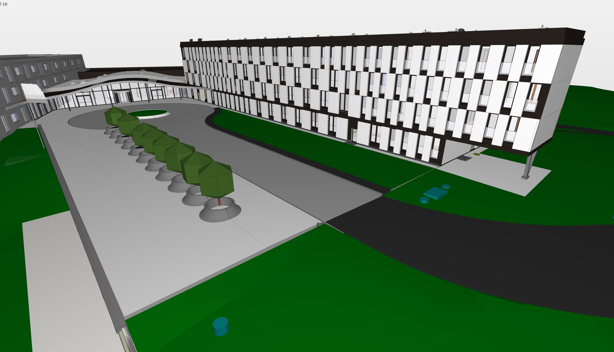 Posebnost je fasada novega kraka, sestavljena iz svetlih in temnih ploskev različnih širin. Temne površine tvorijo okenska zasteklitev, steklene ograje in pločevina v temno sivi barvi. Svetle površine so iz perforiranih aluminijevih panelov, katerih vzorec odslikava neposredno okolico, tj. gozd. Pri določitvi vzorca perforacije je bila uporabljena tehnologija parametričnega modeliranja, ki iz digitalne slike drevesa ustvari navidezno bitno sliko. Pri projektiranju so bili z uporabo BIM tehnologije izdelani modeli arhitekture, gradbenih konstrukcij in komunalne ureditve.