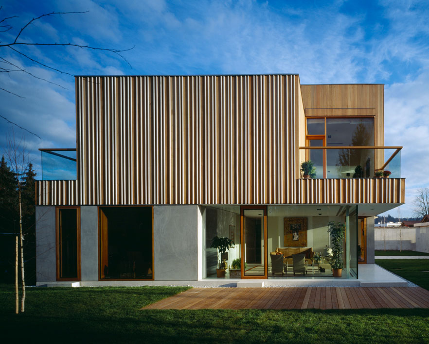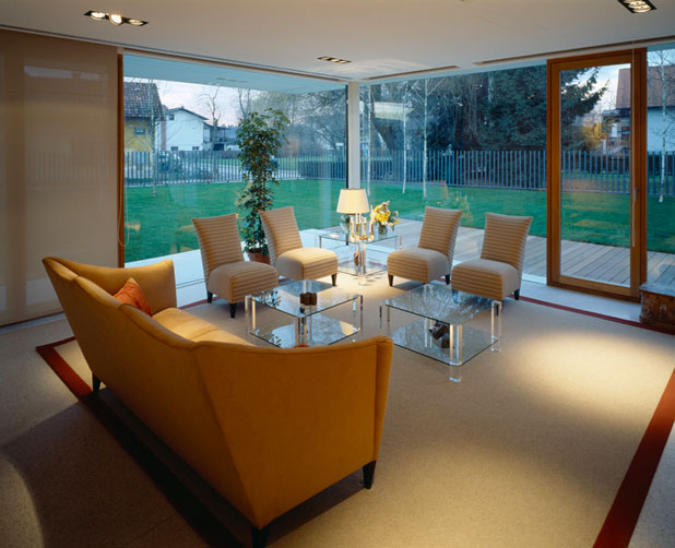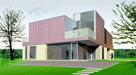 Sodobno zasnovan objekt iz vidnega betona, stekla in jekla, ki je prefinjeno kombiniran z leseno fasado iz sibirske cedre, je z občutkom vključen v zeleno urbano okolje ob Koseškem bajerju.